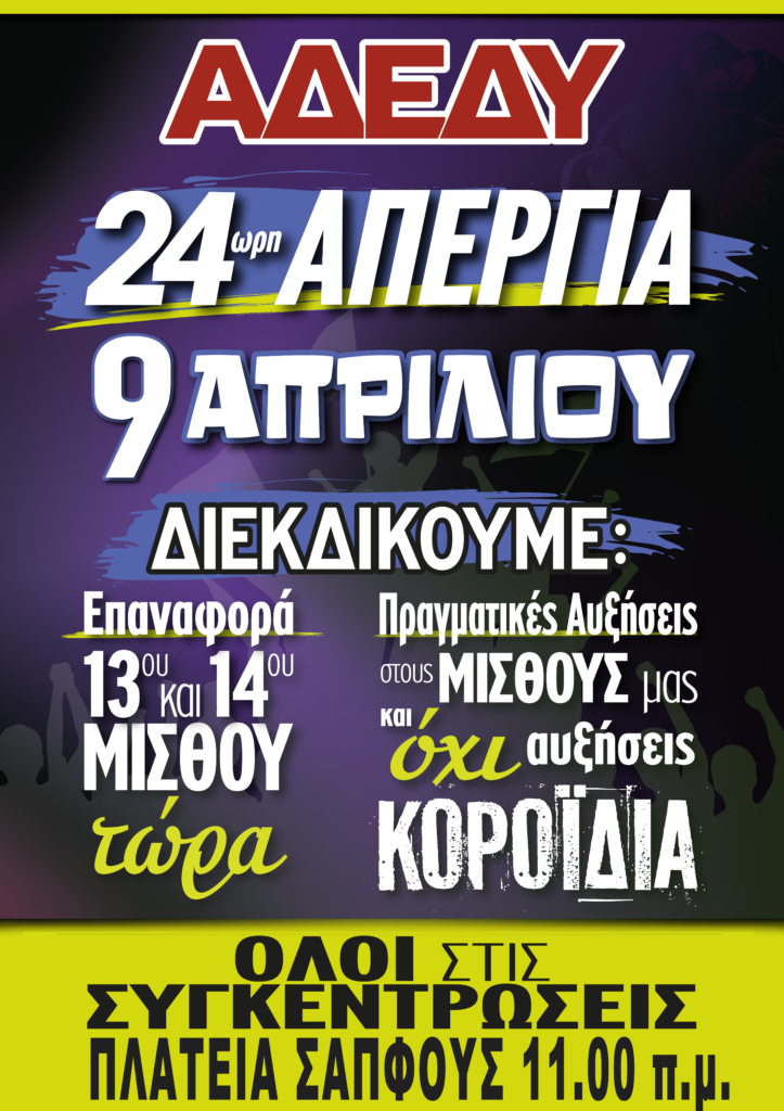 Κάλεσμα στην απεργιακή συγκέντρωση 09-04-2025, 11:00 Πλατεία Σαπφούς